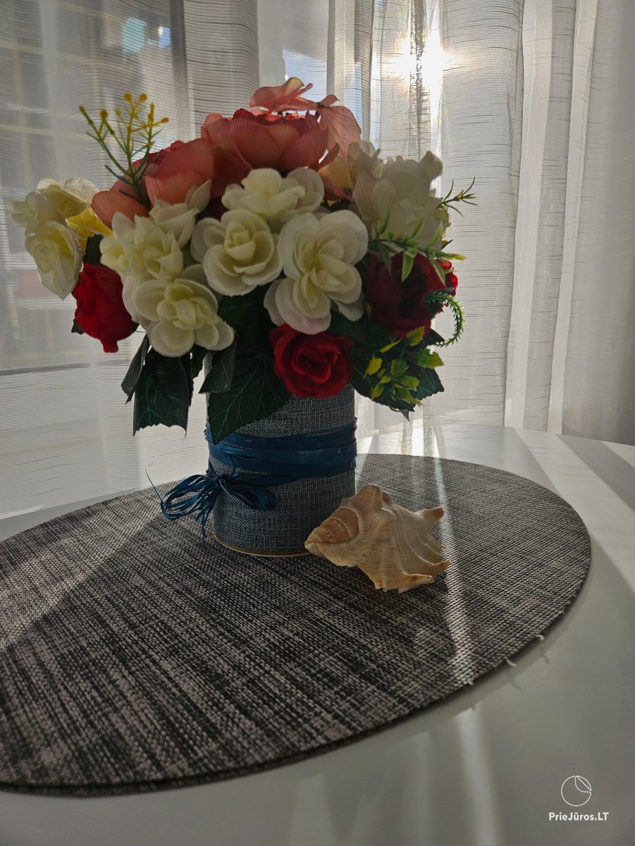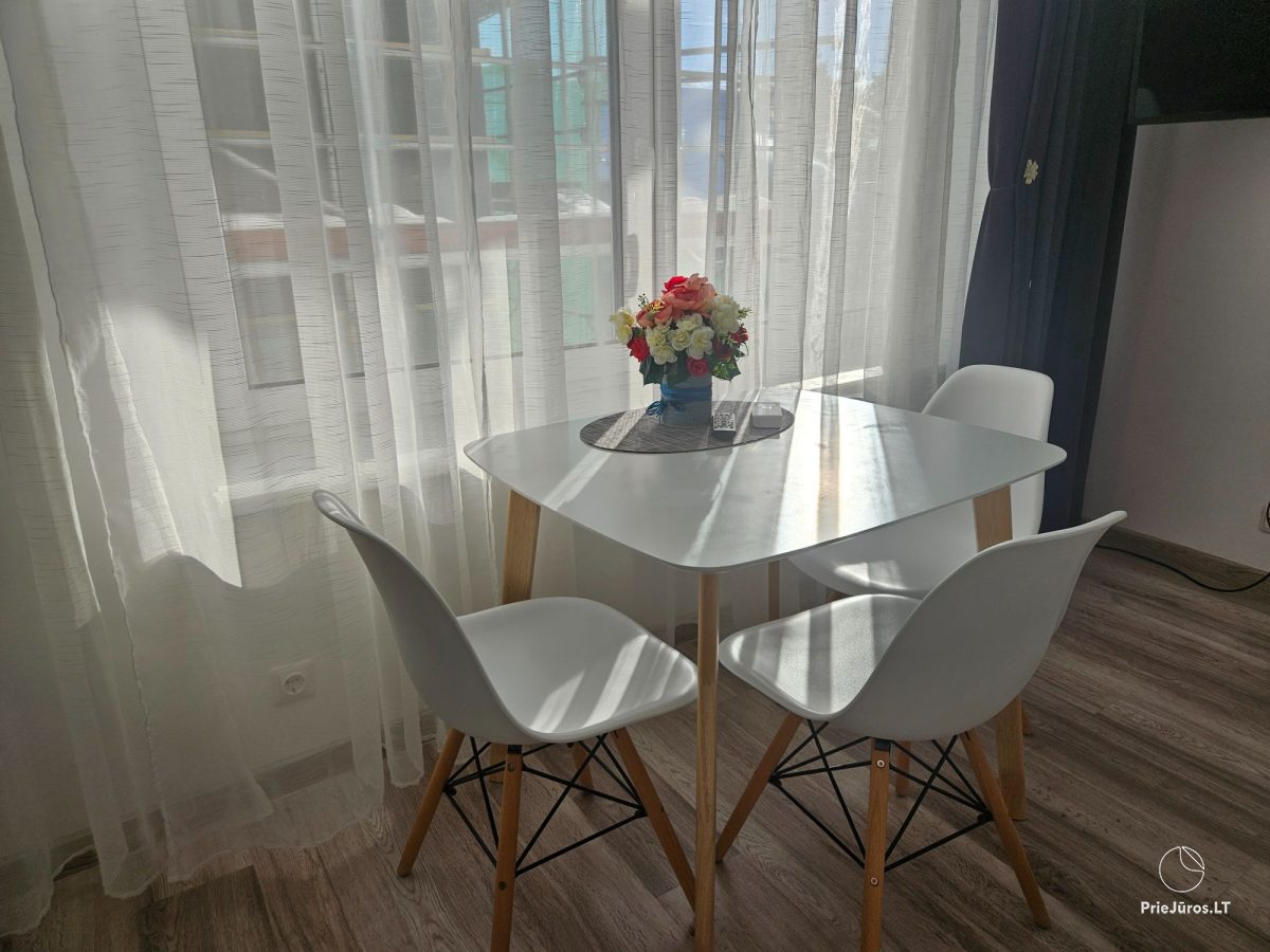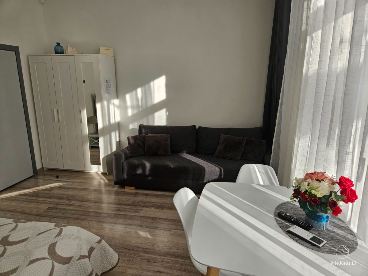 Nidoje, vos už kelių šimtų metrų nuo Nidos miesto centro, įsikūrusiuose apartamentuose veikia nemokamas belaidis internetas ir oro kondicionierius, kuris šaltuoju metu užtikrina šilumą apartamentuose. Apartamentuose yra viena dvigulė lova ir viena sofa-lova. Virtuvėlėje rasite visus reikalingus indus, stalo įrankius, kaitlentę, šaldytuvą, arbatinuką, kavos aparatą ir gartraukį. Vonios kambaryje: WC, dušas, skalbimo mašina, plaukų džiovintuvas, elektrinis gyvatukas, rankšluosčiai. Saldžiam miegui svečiams suteikiama patalynė. Apartamentai ramioje vietoje, per langą vaizdas į kiemą.