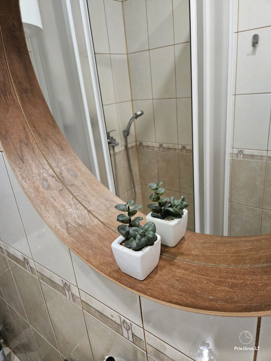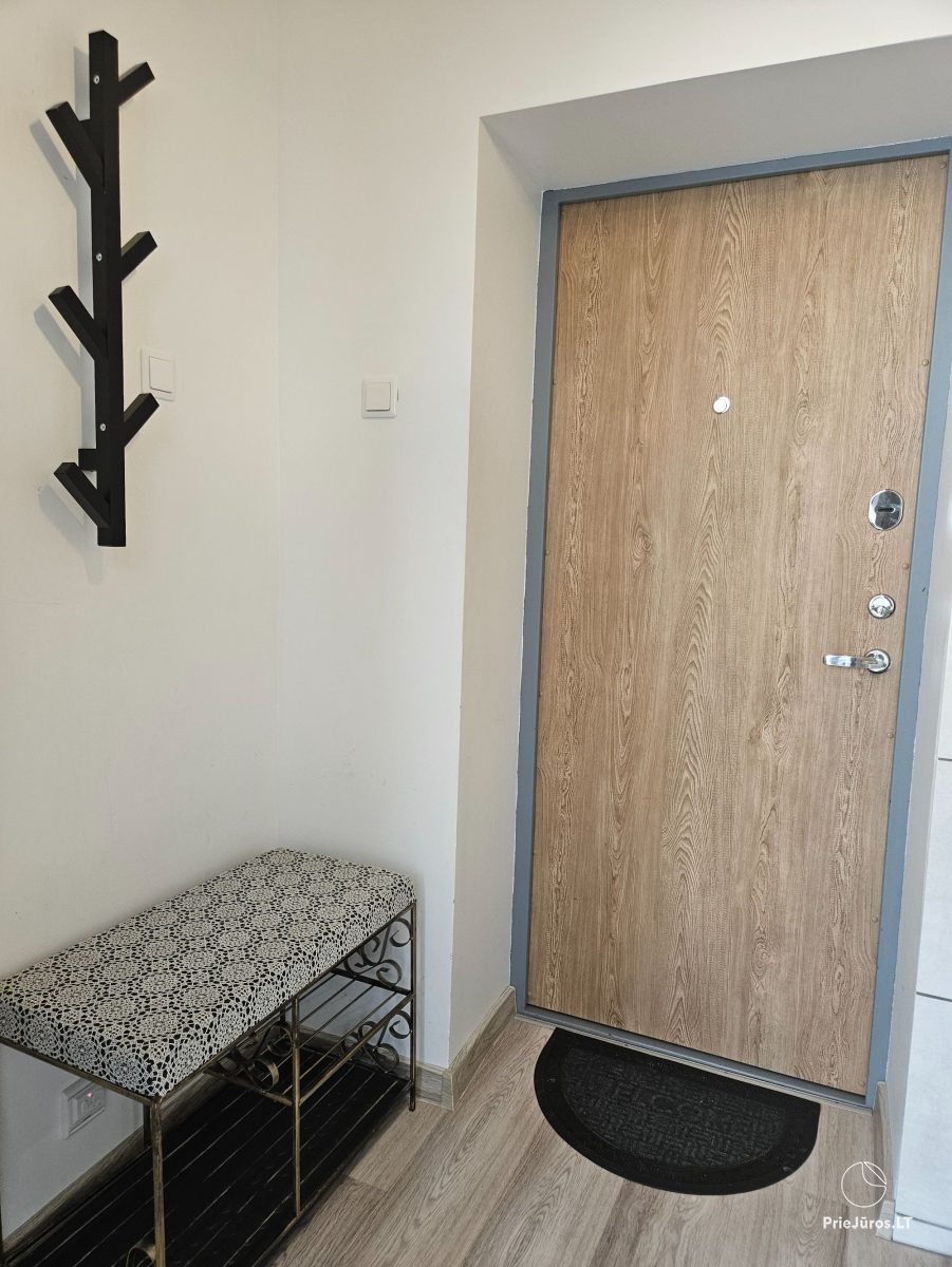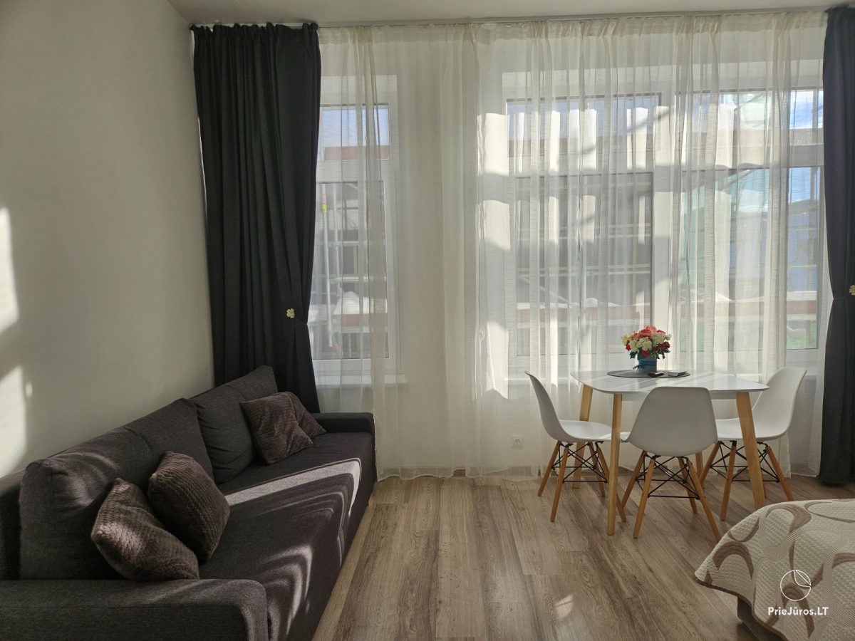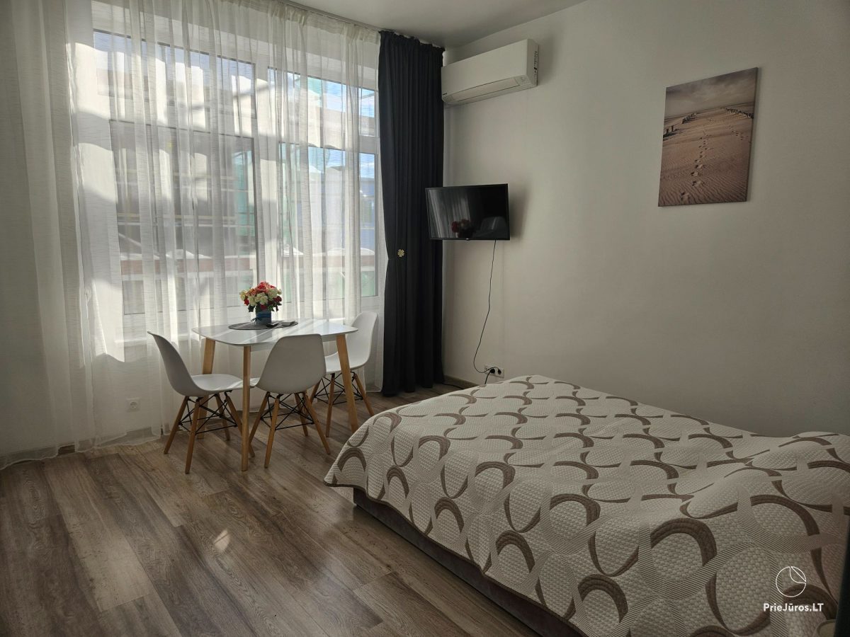 Nidoje, vos už kelių šimtų metrų nuo Nidos miesto centro, įsikūrusiuose apartamentuose veikia nemokamas belaidis internetas ir oro kondicionierius, kuris šaltuoju metu užtikrina šilumą apartamentuose. Apartamentuose yra viena dvigulė lova ir viena sofa-lova. Virtuvėlėje rasite visus reikalingus indus, stalo įrankius, kaitlentę, šaldytuvą, arbatinuką, kavos aparatą ir gartraukį. Vonios kambaryje: WC, dušas, skalbimo mašina, plaukų džiovintuvas, elektrinis gyvatukas, rankšluosčiai. Saldžiam miegui svečiams suteikiama patalynė. Apartamentai ramioje vietoje, per langą vaizdas į kiemą.