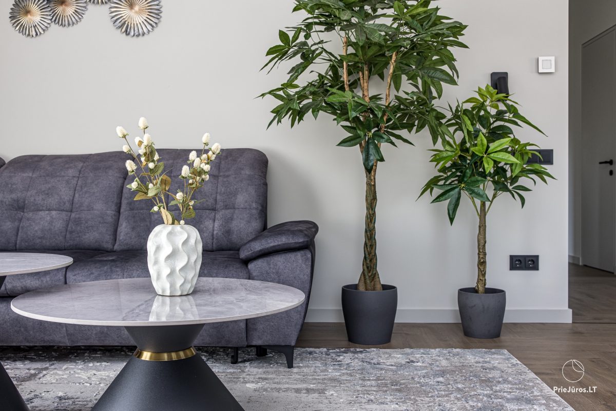 - Pilnai įrengta – pasiruošta Jūsų poilsiui. Oro kondicionierius, kokybiška buitinė technika, modernūs baldai ir visa reikalinga įranga patogiam apsistojimui.