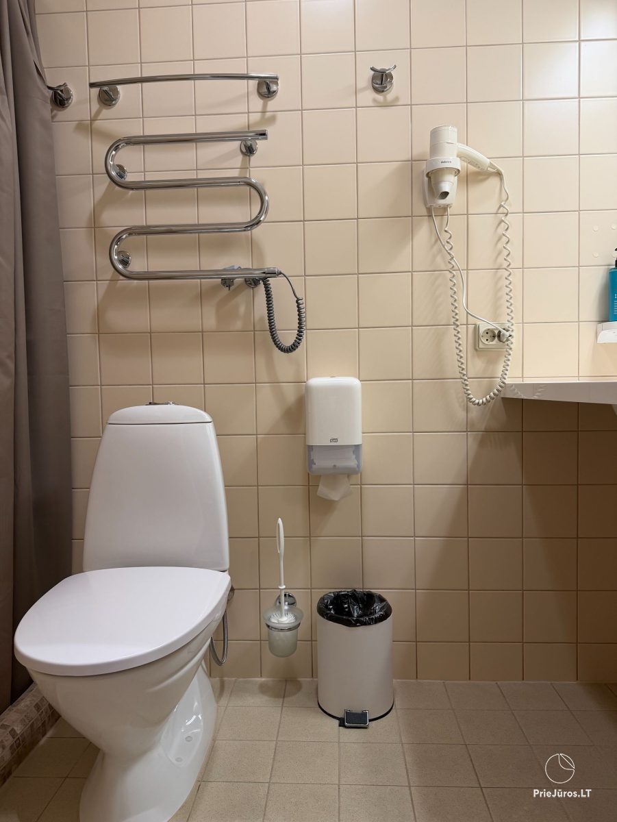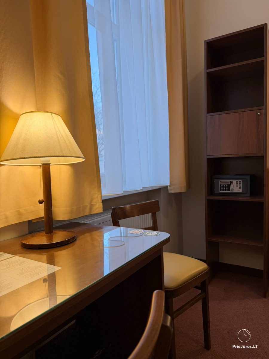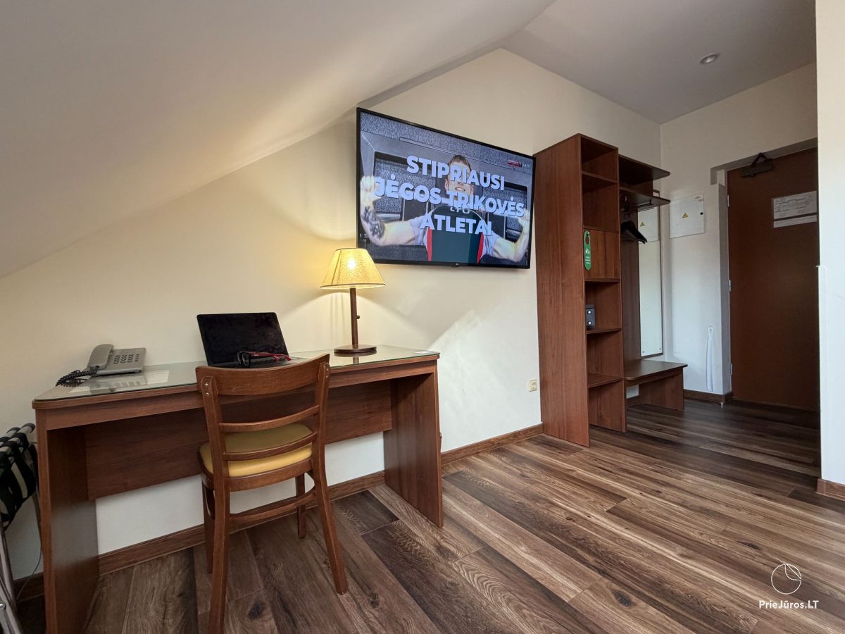 Be to, jeigu viešnagės metu reikia dirbti, mūsų nemokamas belaidis internetas ir patogūs darbo stalai yra idealus sprendimas. Galite lengvai ir patogiai dirbti viešbutyje, taip užtikrindami produktyvumą ir neprarandant komforto. Mūsų prioritetas – užtikrinti, kad kiekvienas svečias jaustųsi kaip namie ir galėtų pasinaudoti visais patogumais.