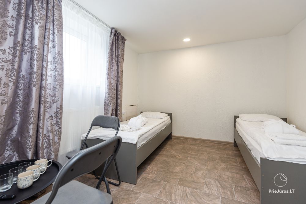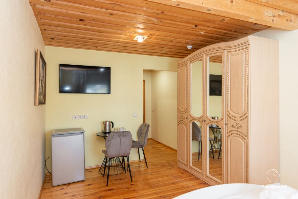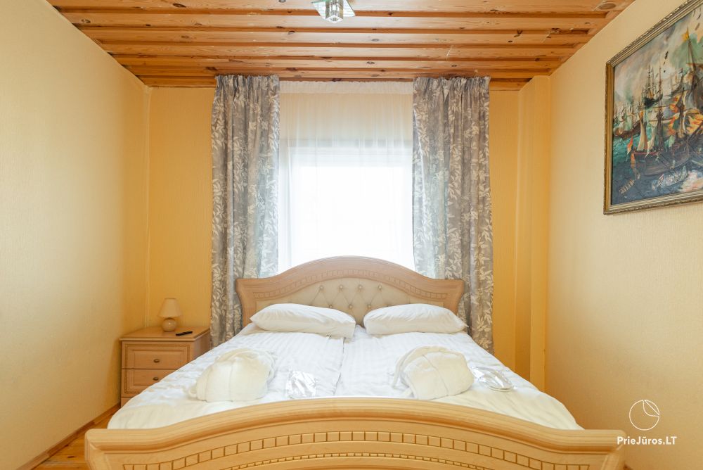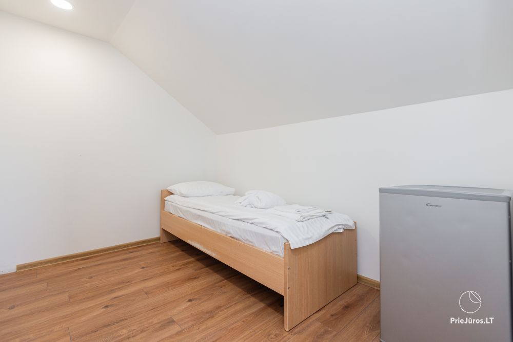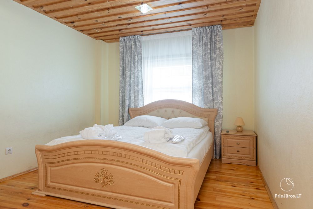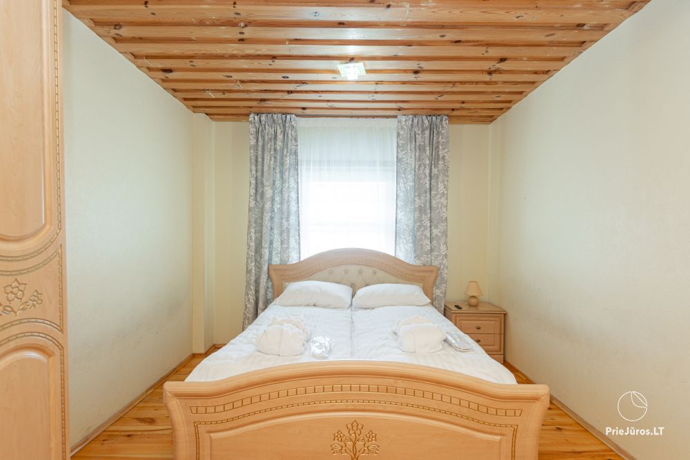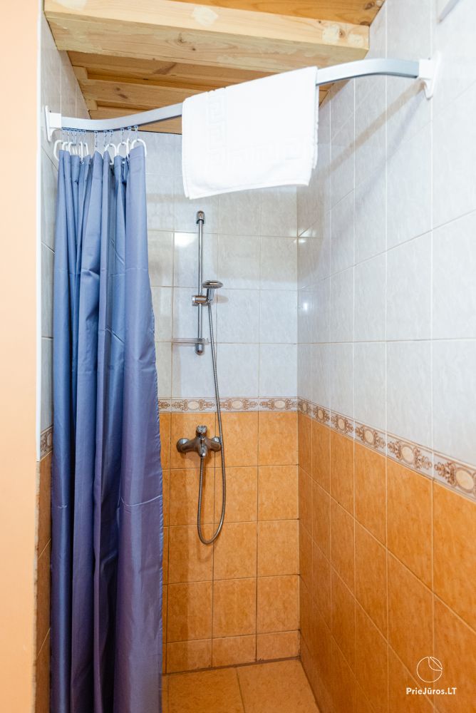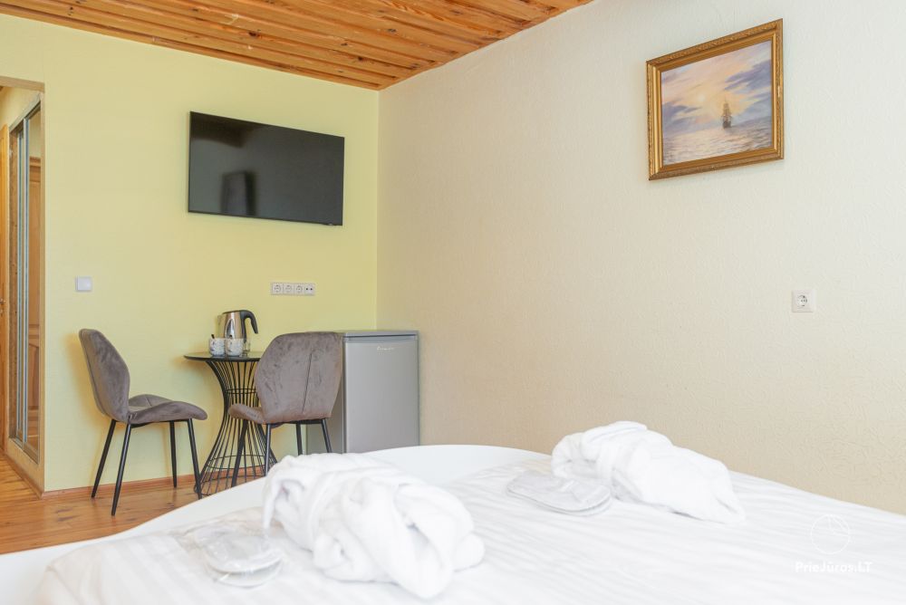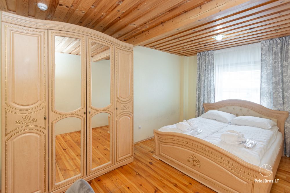 Svečių namuose yra 8-ni dviviečiai kambariai su atskirais dušais bei WC, 2 numeriai yra su dvejais miegamaisiais, jame gali apsistoti nuo 3-jų iki 5-kių asmenų. Taip pat yra pigesnių numerių cokoliniame aukšte su atskirais dušais bei WC, SMART TV, šaldytuvais su šaldymo kameromis. Turime 9-nis triviečius kambarius su atskirais dušais bei WC, SMART TV, šaldytuvais su šaldymo kameromis. Kai kuriuose kambariuose yra kondicionieriai ir balkonai.