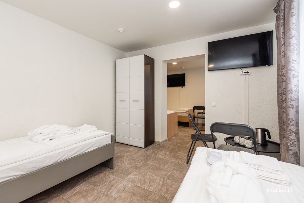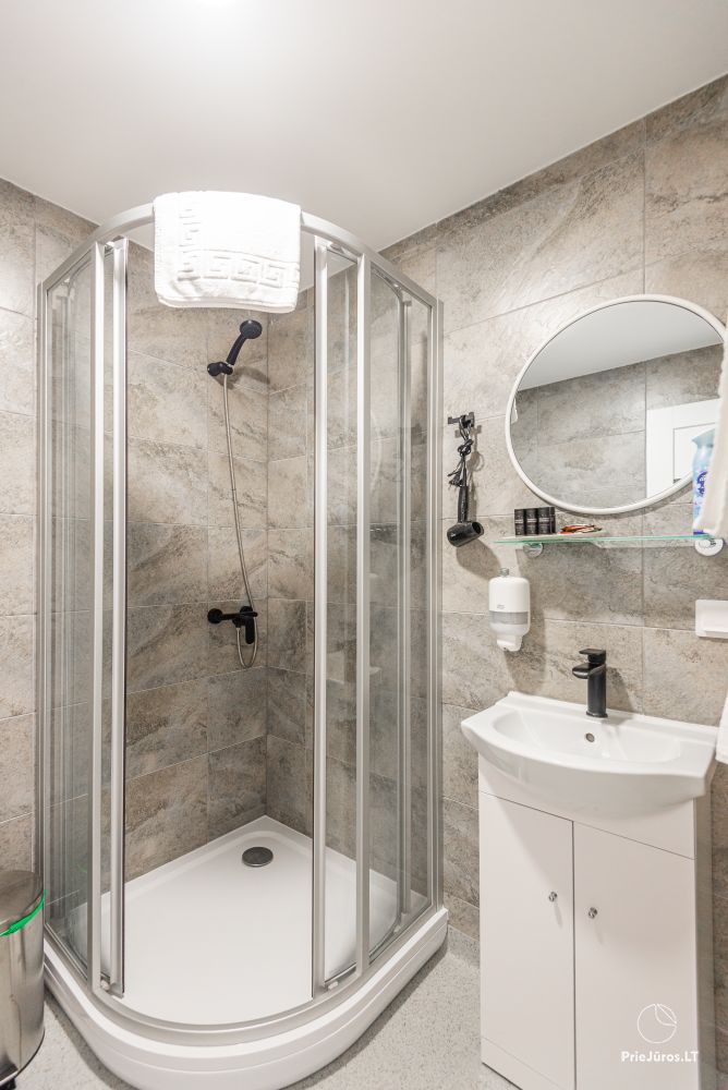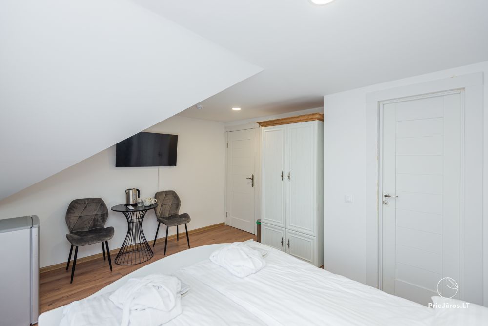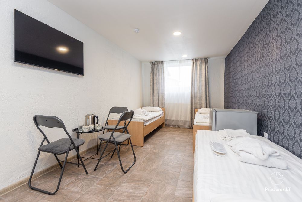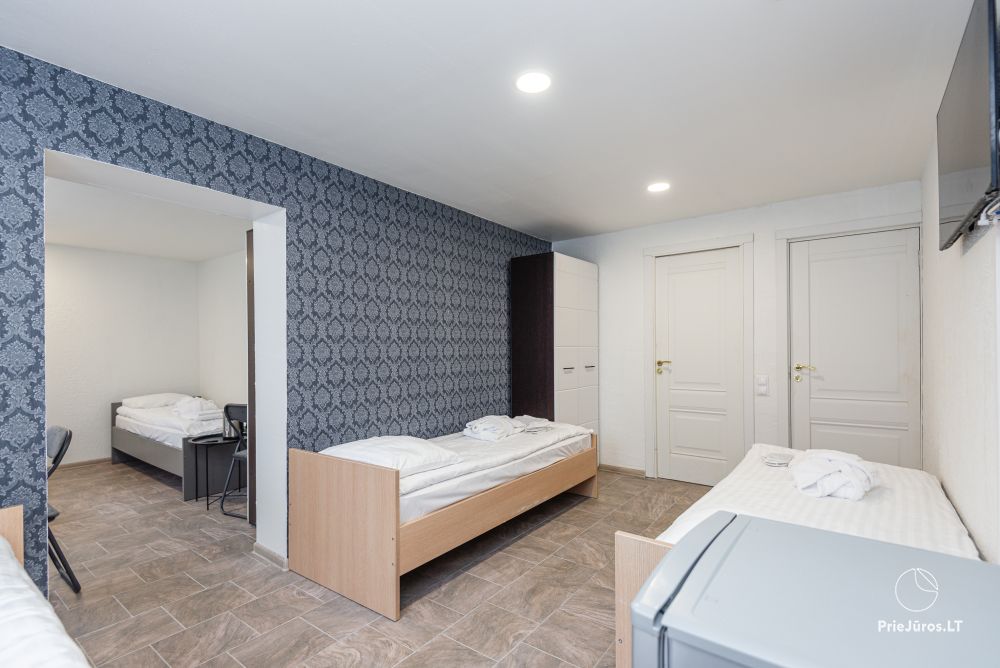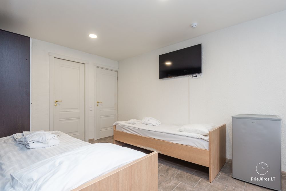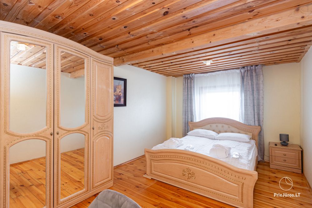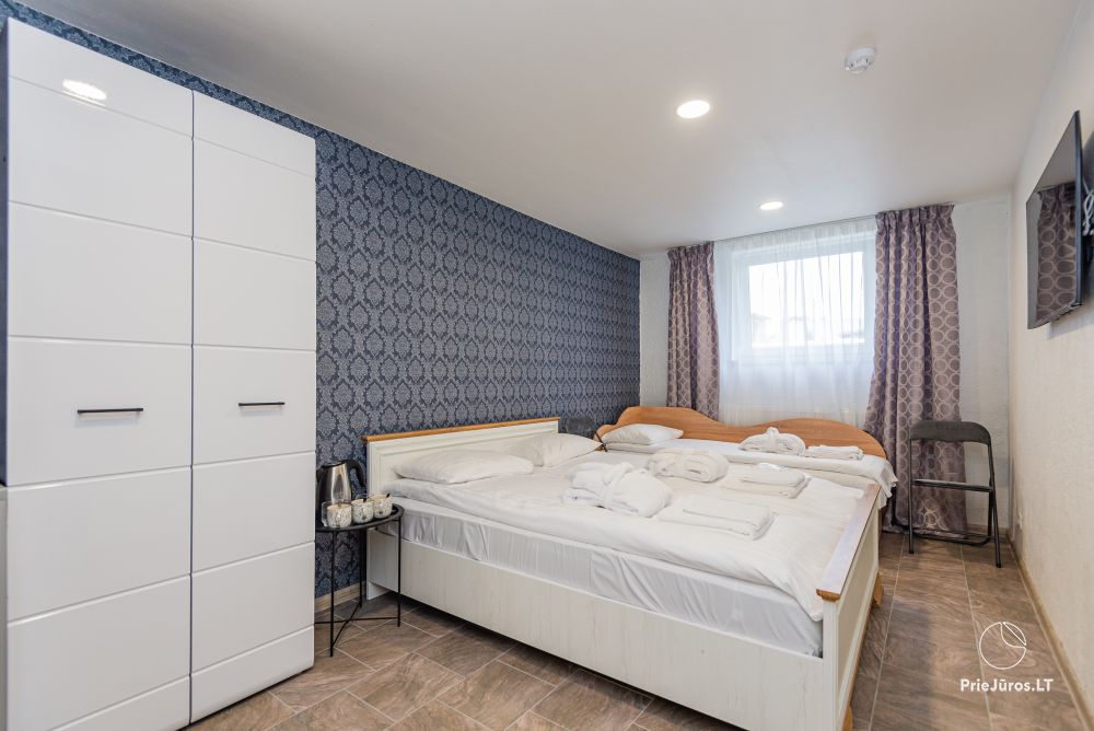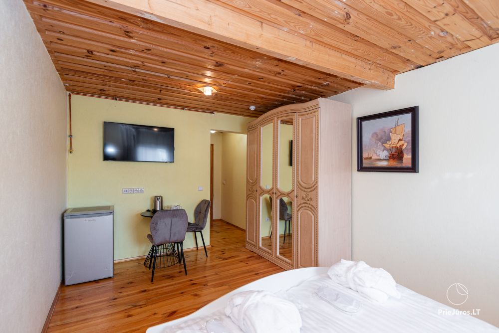 Svečių namuose yra 8-ni dviviečiai kambariai su atskirais dušais bei WC, 2 numeriai yra su dvejais miegamaisiais, jame gali apsistoti nuo 3-jų iki 5-kių asmenų. Taip pat yra pigesnių numerių cokoliniame aukšte su atskirais dušais bei WC, SMART TV, šaldytuvais su šaldymo kameromis. Turime 9-nis triviečius kambarius su atskirais dušais bei WC, SMART TV, šaldytuvais su šaldymo kameromis. Kai kuriuose kambariuose yra kondicionieriai ir balkonai.