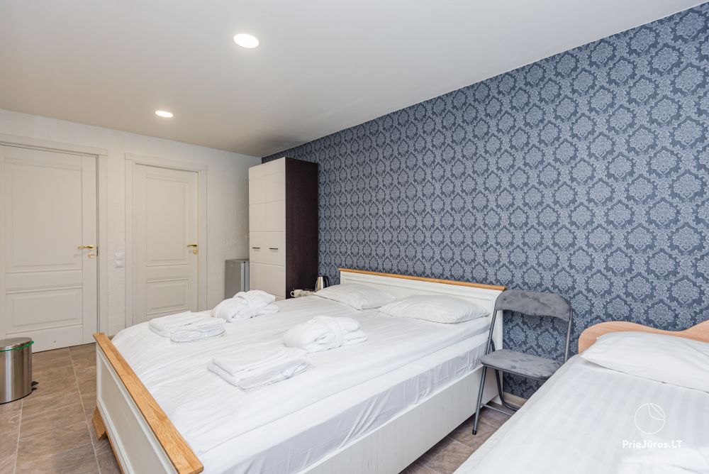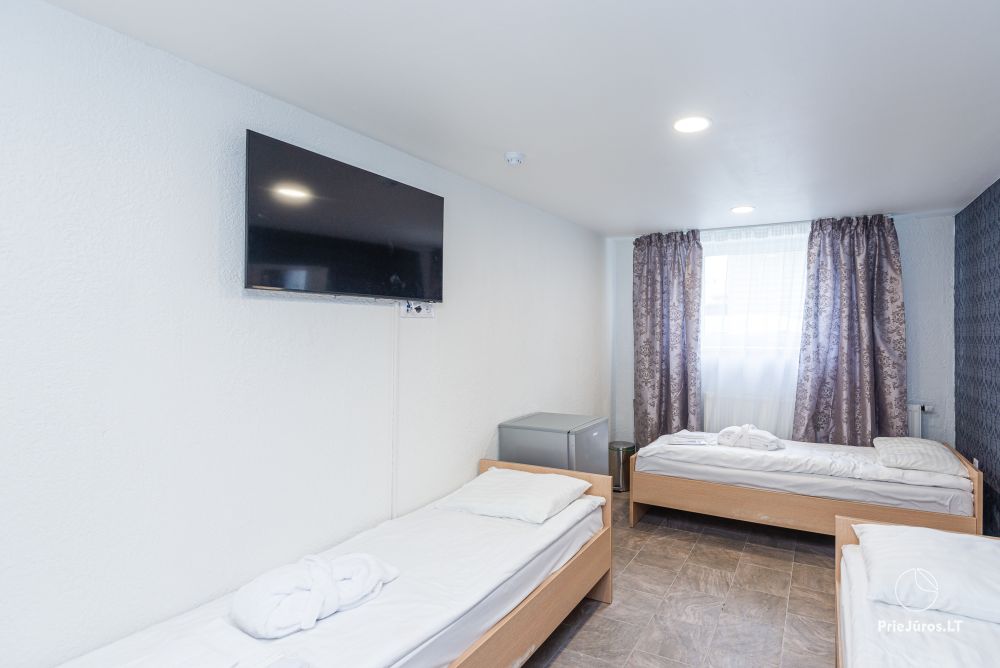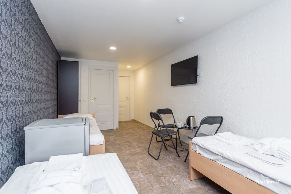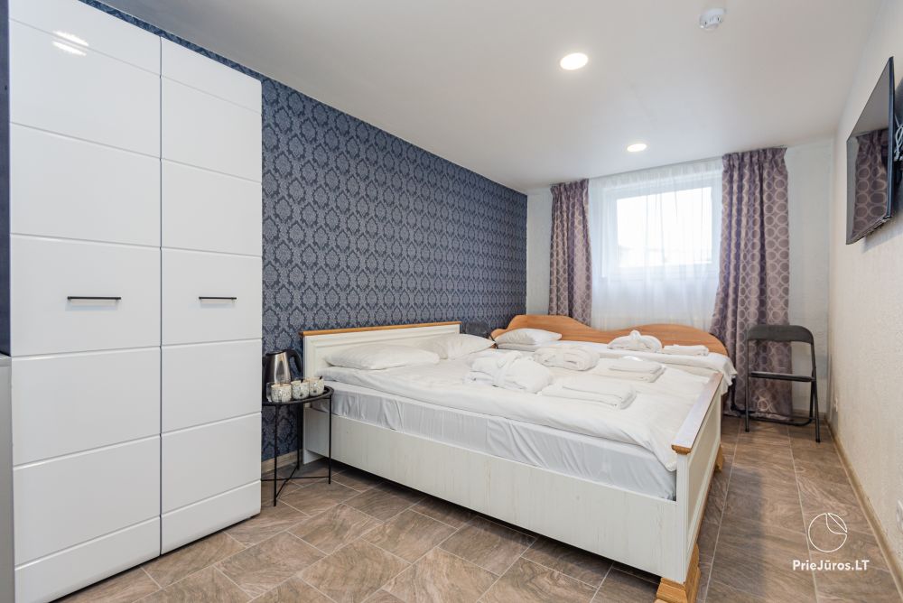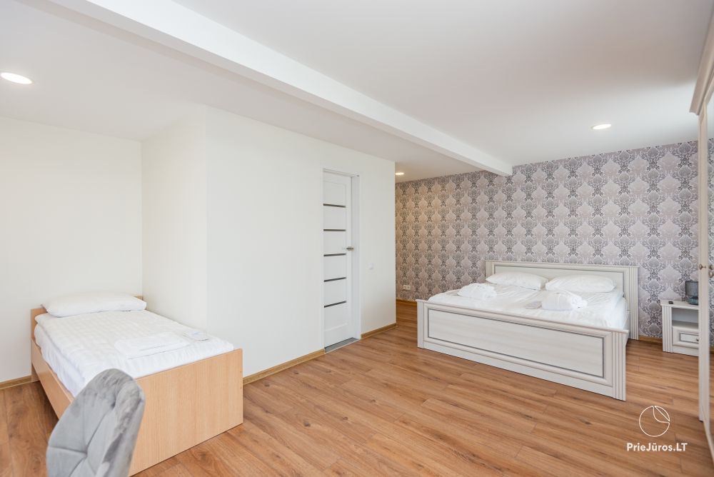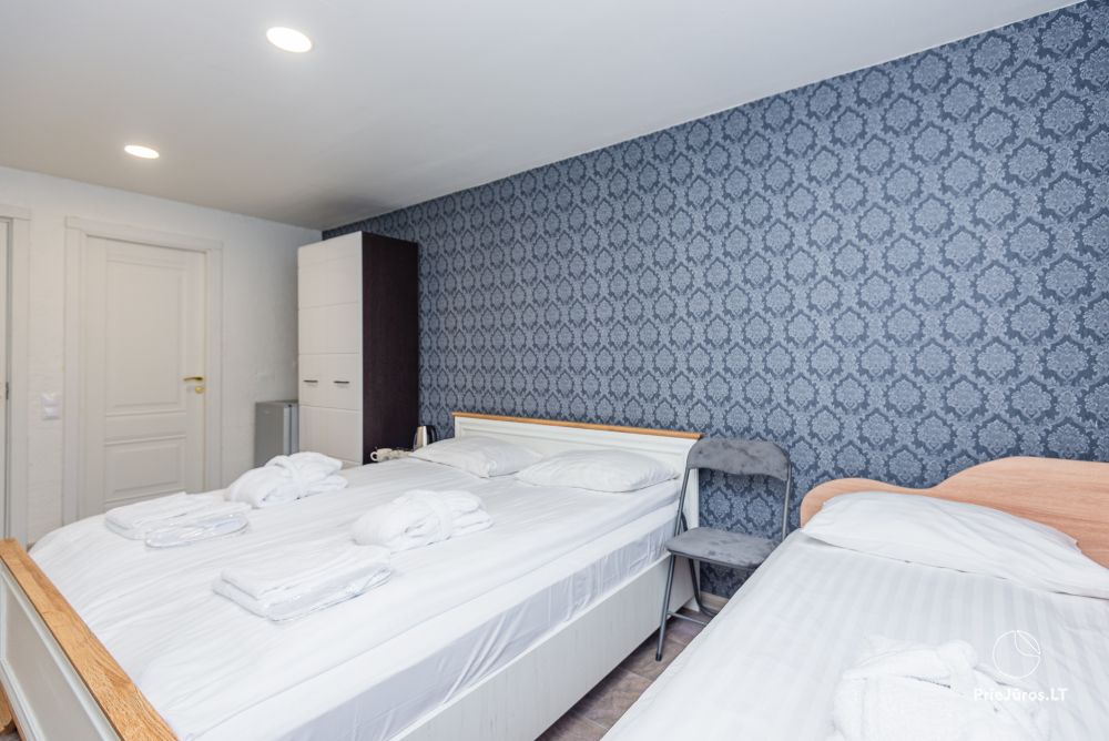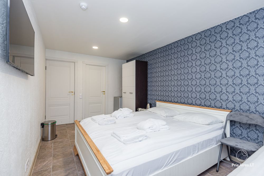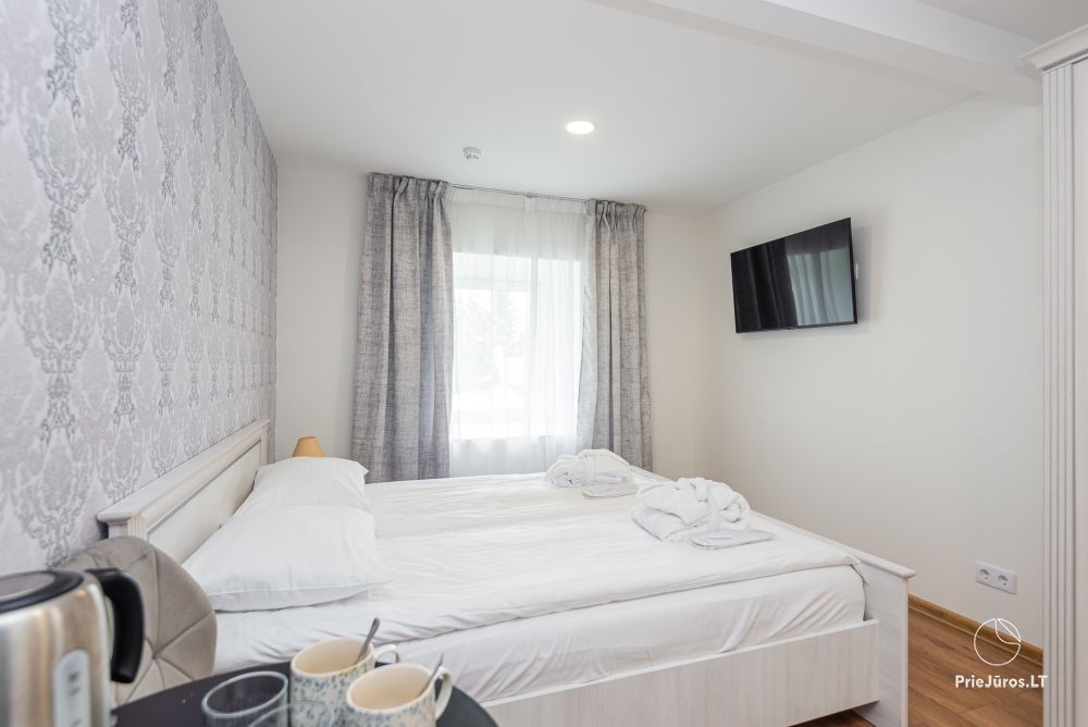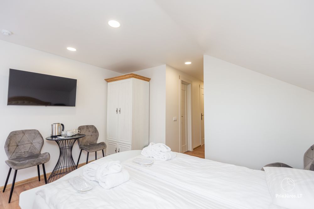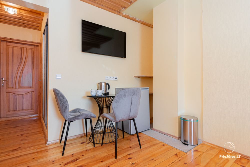 Svečių namuose yra 8-ni dviviečiai kambariai su atskirais dušais bei WC, 2 numeriai yra su dvejais miegamaisiais, jame gali apsistoti nuo 3-jų iki 5-kių asmenų. Taip pat yra pigesnių numerių cokoliniame aukšte su atskirais dušais bei WC, SMART TV, šaldytuvais su šaldymo kameromis. Turime 9-nis triviečius kambarius su atskirais dušais bei WC, SMART TV, šaldytuvais su šaldymo kameromis. Kai kuriuose kambariuose yra kondicionieriai ir balkonai.