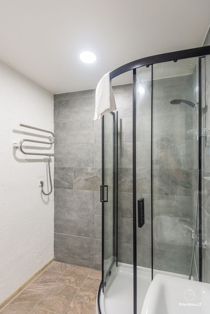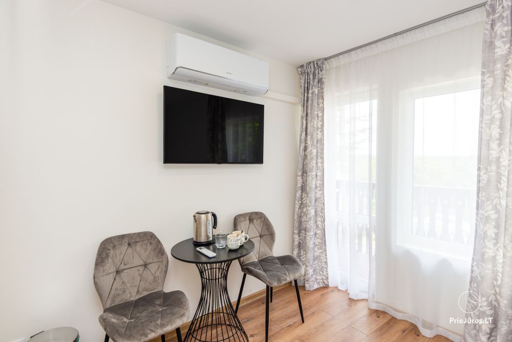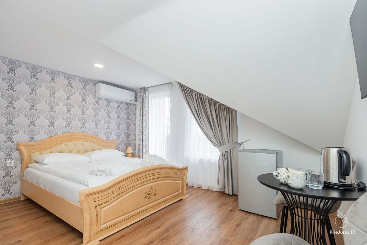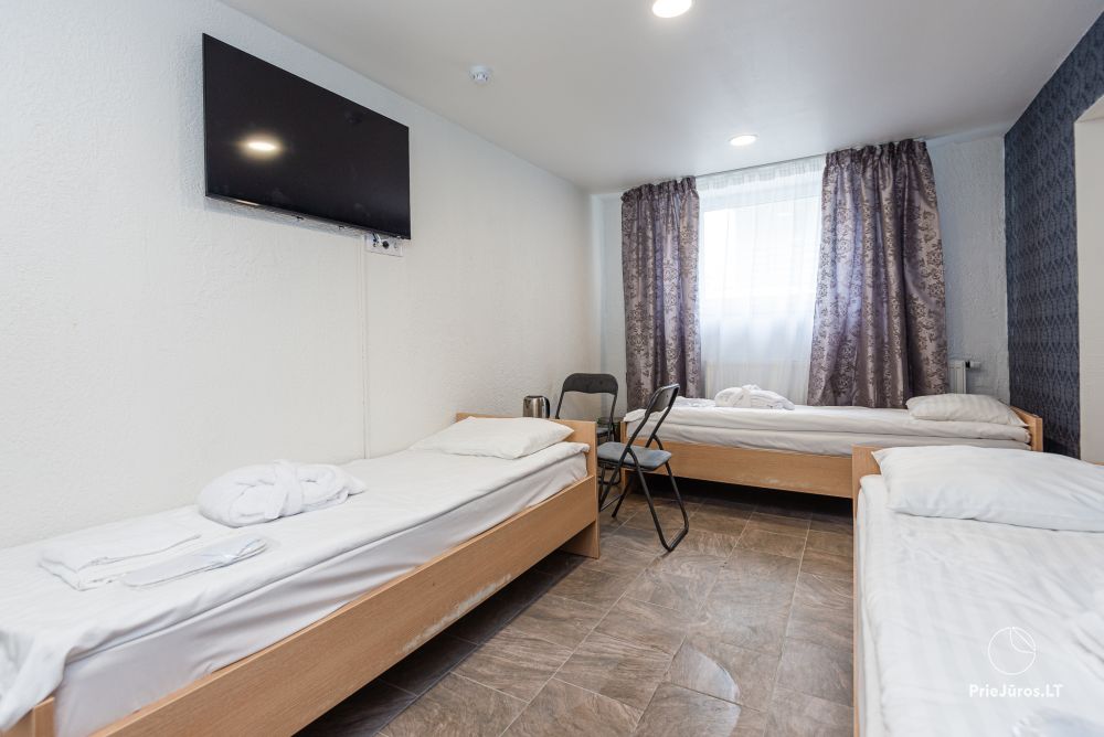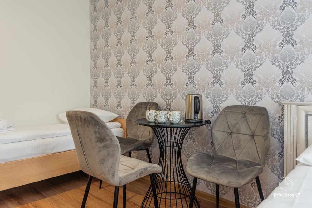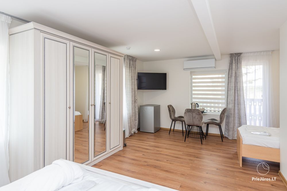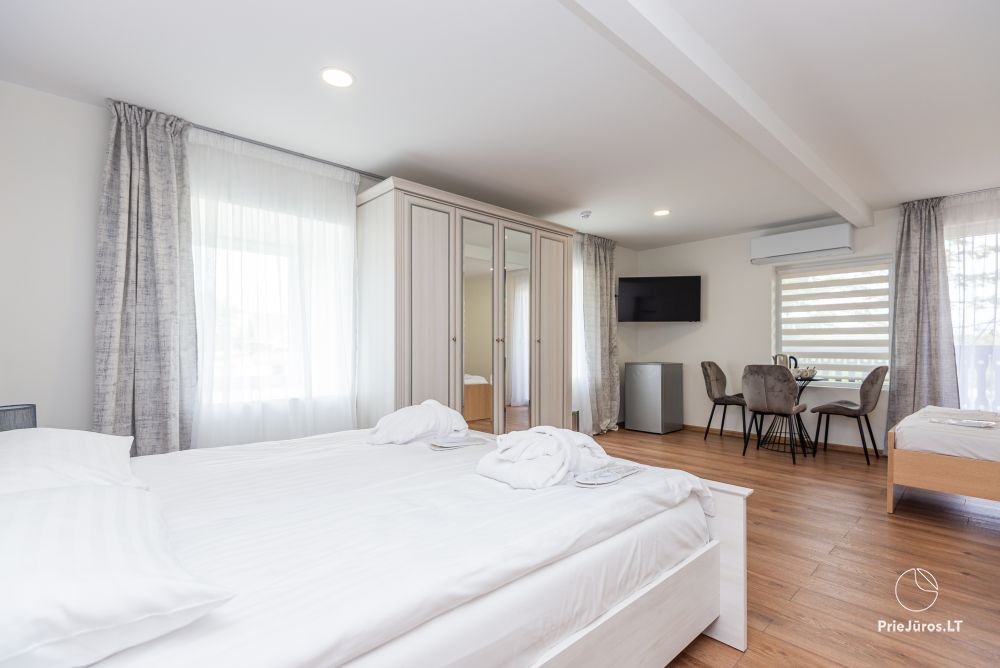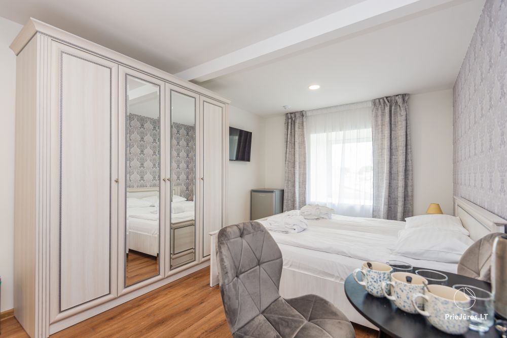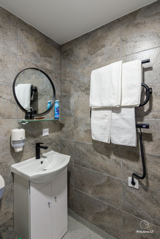 Svečių namuose yra 8-ni dviviečiai kambariai su atskirais dušais bei WC, 2 numeriai yra su dvejais miegamaisiais, jame gali apsistoti nuo 3-jų iki 5-kių asmenų. Taip pat yra pigesnių numerių cokoliniame aukšte su atskirais dušais bei WC, SMART TV, šaldytuvais su šaldymo kameromis. Turime 9-nis triviečius kambarius su atskirais dušais bei WC, SMART TV, šaldytuvais su šaldymo kameromis. Kai kuriuose kambariuose yra kondicionieriai ir balkonai.